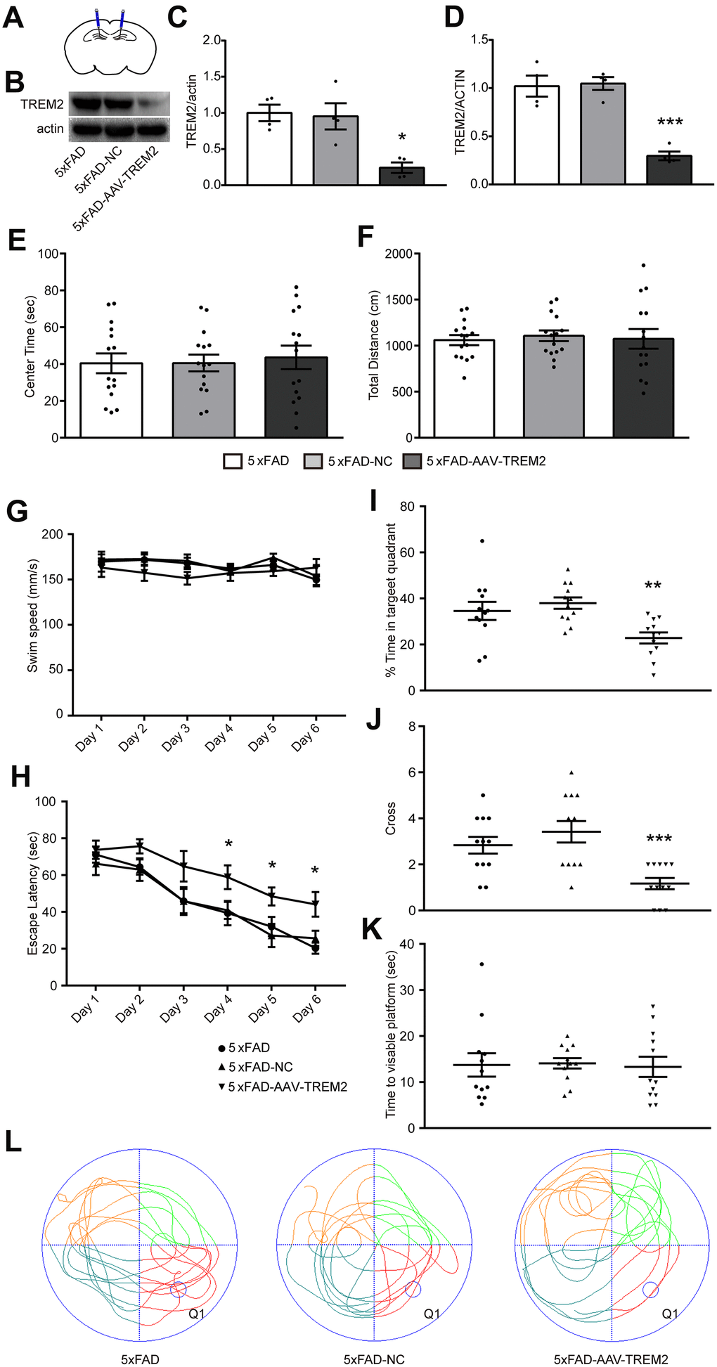 Then, the spatial learning and memory were assessed by the Morris Water Maze test (MWM). Spatial learning was examined through continuous 6 days training trails. Swim speed in training trails was similar in all of the groups (Figure 3G). The escape latency to find the hidden platform was significantly increased on day 4 to 6 in 5xFAD-AAV-TREM2 group compared with the other two groups, and no differences between 5xFAD and 5xFAD-AAV-NC group (Figure 3H). In the probe test (hidden platform was removed away), which was used for evaluating the memory recall, the percentage of time in the target quadrant, as well as the time crossing the platform were significantly decreased in 5xFAD- AAV-TREM2 group compared to 5xFAD and 5xFAD-AAV-NC groups (Figure 3I, 3J, 3L). There were no differences in the time moving to visible platform among all groups (Figure 3K). Taken together, these results indicated that the learning and memory function was significantly attenuated in the 5xFAD-AAV-TREM2 (TREM2-lack) group without movement disorder and anxious behaviors.