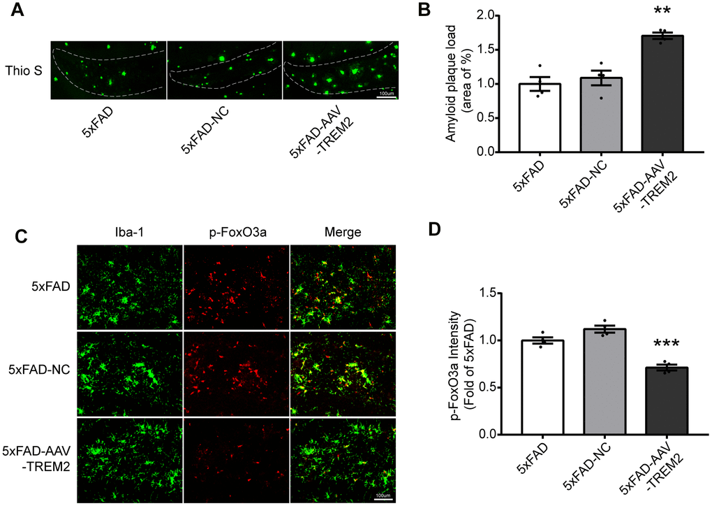 First, the load of amyloid plaques was stained with Thio S to verify if TREM2 can modulate Aβ clearance of microglia. The increased Aβ was observed in 5xFAD-AAV-TREM2 group compared with other groups (Figure 4A, 4B). Next, whether TREM2 knockdown affects FoxO3a activation in microglia was investigated. The number of microglia (Iba-1) was significantly decreased around amyloid plaques in 5xFAD-AAV-TREM2 group (Figure 4C, 4D). The number of overlap cells, p-FoxO3a and Iba-1, was significantly decreased and the p-FoxO3a level was downregulated in DG area in 5xFAD-AAV-TREM2 group (Figure 4C, 4D). Taken together, TREM2 deficiency significantly activated FoxO3a (having less p-FoxO3a) and increased the amyloid plaques, suggesting FoxO3a may participate in TREM2-mediated AD pathology in the transgenic mice.