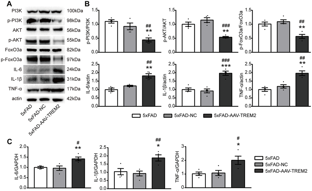 Several studies have demonstrated that AKT/FoxO3a pathway is involved in the inflammatory response in microglia. To further corroborate the association between TREM2 and PI3K/AKT/FoxO3a signaling, the active condition of PI3K/AKT/FoxO3a pathway and the inflammatory cytokine levels have been evaluated in the DG area of hippocampus from sacrificed mice on the 3rd day after MWM by western blot and qPCR (Figure 5A, 5B). TREM2 deficiency significantly decreased the levels of downstream molecules including p-PI3K, p-AKT, p-FoxO3a and significantly increased the protein expressions of IL-6, TNF-α and IL-1β, compared to 5xFAD-AAV-NC and 5xFAD groups. Similarly, the upregulated mRNA levels of pro-inflammatory cytokine were also been observed in 5xFAD-AAV-TREM2 (Figure 5C). In summary, TREM2 deficiency inactivated the PI3K/AKT/FoxO3a pathway and increased the inflammatory cytokines in 5xFAD mice.