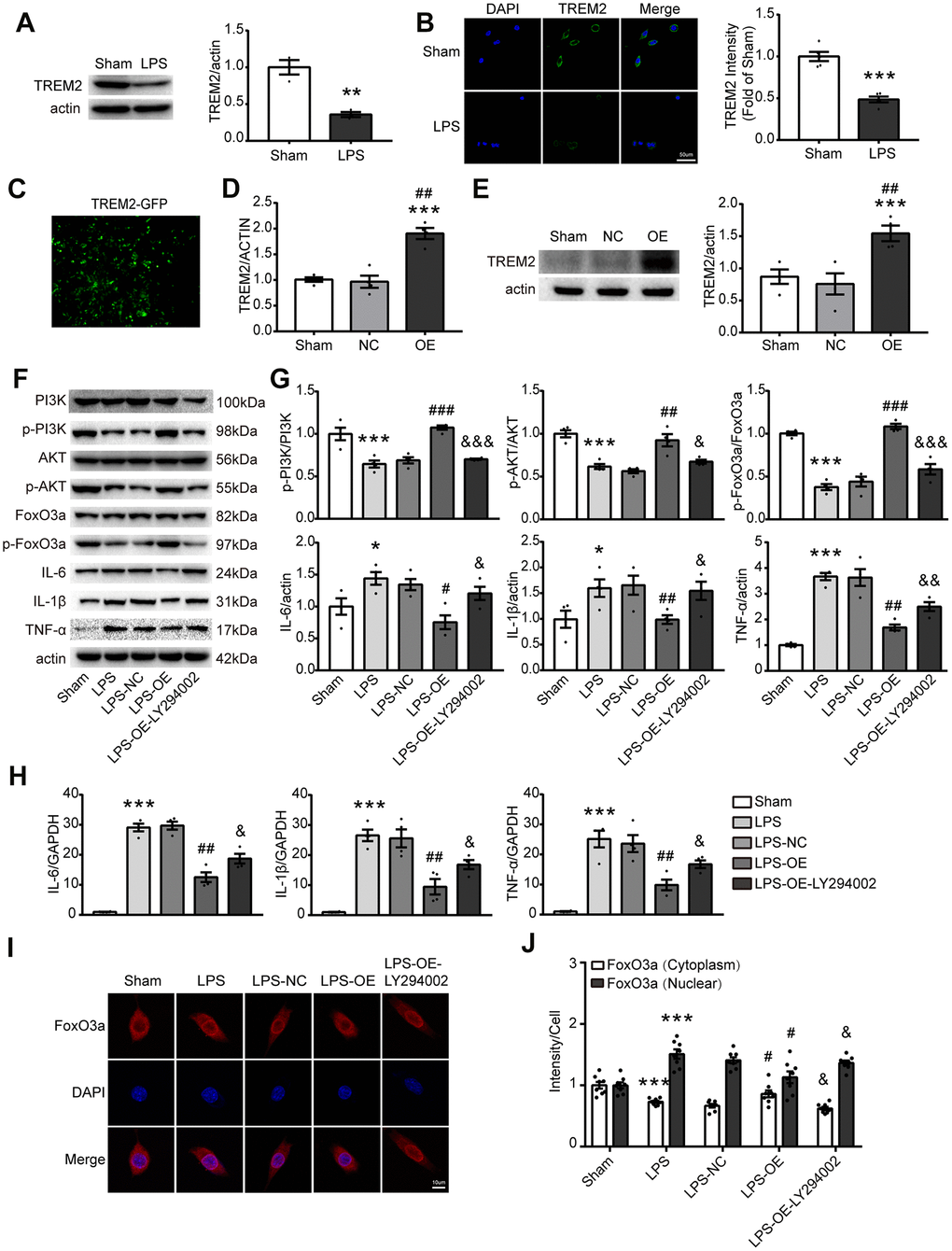 To further investigate TREM2-induced anti-inflammation via PI3K/AKT/FoxO3a signaling, overexpression plasmid of TREM2 and LY294002 (PI3K inhibitor) were used in BV2 cells. Cells were divided into five groups: Sham, LPS, LPS+NC (LPS+Negative vector), LPS+OE (LPS+TREM2/vector), LPS+OE+LY294002 (LPS+TREM2/vector+LY294002). Western blot and qPCR were carried out for the efficiency of transfection at 48-72 hr after plasmid transfection. Then, the PI3K/AKT/FoxO3a pathway and inflammatory response were evaluated by western blot and qPCR. Moreover, the microglia phenotype and localization of FoxO3a were detected by immunofluorescence to demonstrate that FoxO3a is involved in TREM2-regulating microglia phenotype switch.