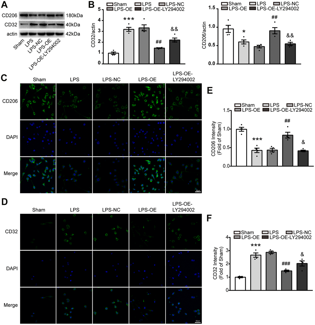 Activated microglia were divided into ‘pro-inflammatory’ microglia and ‘anti-inflammatory’ microglia in the brain, they are important to inflammatory response. To investigate whether TREM2 regulated the microglia polarization via PI3K/AKT/FoxO3a axis, the protein of CD206 and CD32 were assessed by western blot, also immunocytochemistry was used to analyze the phenotypes of microglial cells after staining with anti-CD32(for M1) and anti-CD206(for M2) antibodies. The expression of CD206 significantly decreased under the stimulation of LPS, whereas TREM2 overexpression could restore it. However, the expression of CD206 induced by overexpression of TRME2 could be blocked by LY294002 (Figure 7A–7C, 7E). Conversely, the expression of CD32 markedly increased by LPS-stimulation, and could be restored by TREM2 upregulation. The expression of CD32 under TREM2 upregulation was abolished by LY294002 (Figure 7A, 7B, 7D, 7F). These data suggested that TREM2 could switch the phenotype of microglia via PI3K-FoxO3a pathway.