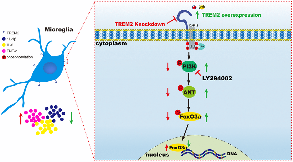 Summary of the relations among TREM2 receptor, the PI3K/AKT/FoxO3a pathway and the levels of pro-inflammatory factors