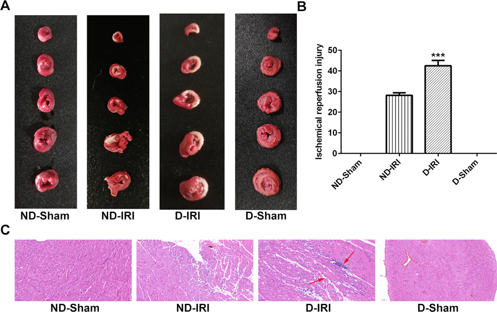 As shown in Figure 1A, 1B, TTC staining showed that the infarct size in D-IRI group was significantly increased compared to the ND-IRI group. Moreover, there was no obvious infarct field in ND-Sham and D-Sham groups. In the IR group, loss of myofibril, cardiomyocytes necrosis and abnormal structure emerged (Figure 1C). These results indicated that the cardiac function dramatically descended and the model was established successfully.