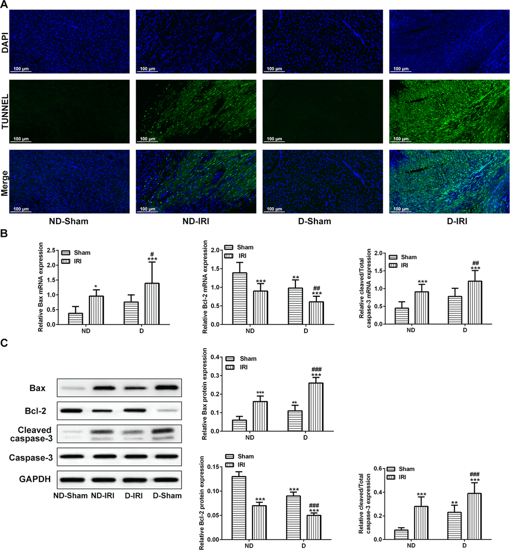 As shown in Figure 2A, apoptosis detected by TUNEL assay was observed in ND-IRI and D-IRI groups but not in ND-Sham and D-Sham groups, and D-IRI rats presented more significant increase of apoptosis level than ND-IRI rats. According to the above results, we speculated that the key biomarkers of apoptosis might participate in the pathological processes of D-IRI or ND-IRI. The expression of Bax, Bcl-2 and cleaved caspase-3 (activated form of caspase-3) was examined by RT-qPCR and western blot assays. The RT-qPCR results revealed that Bcl-2 was significantly reduced in ND-IRI and D-IRI groups compared to ND-Sham and D-Sham groups, respectively (Figure 2B). Meanwhile, the Bcl-2 expression in D-IRI group was remarkably decreased compared to ND-IRI group (Figure 2B, P<0.001). However, Bax and cleaved caspase-3 expression were remarkably increased in ND-IRI and D-IRI groups compared to ND-Sham and D-Sham groups, respectively. The expression changes in D-IRI group were more than those in ND-IRI group (Figure 2C). Moreover, the western blot assay also illustrated the same changes of Bcl-2, Bax and cleaved caspase-3 (Figure 2C). These results indicated that apoptosis might be involved in D-IRI.