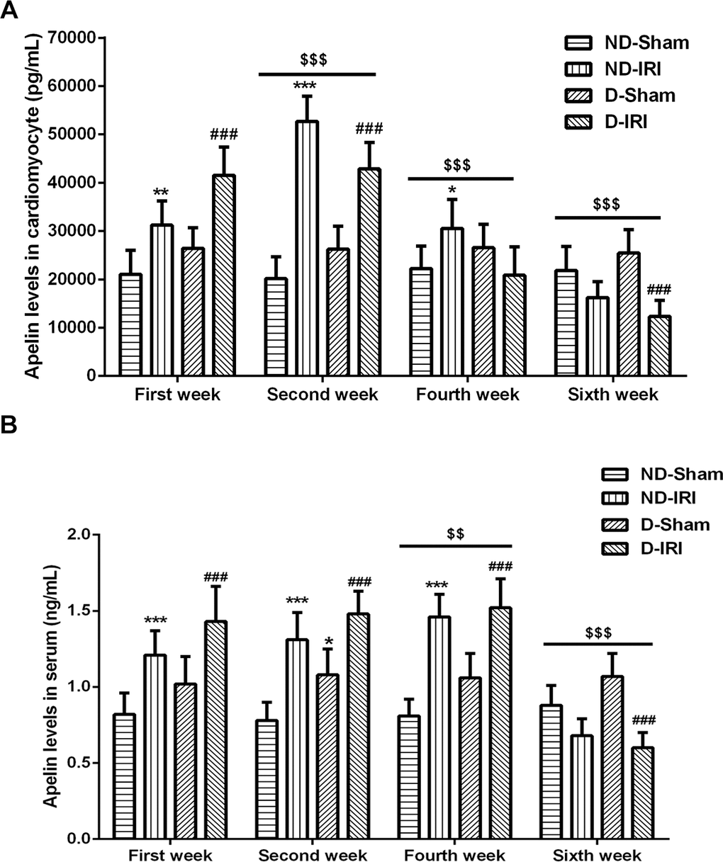 In order to discover a biomarker that triggers the diabetic myocardial ischemia reperfusion injury, the cardiovascular disease-related protein, Apelin, was examined in both myocardial tissues and serum. In the former two weeks, the expression levels of Apelin in myocardium tissues were increased in ND-IRI and D-IRI groups compared with ND-Sham and D-Sham groups (Figure 3A). Also, the Apelin levels were expressed more in D-IRI group than in ND-IRI group (Figure 3A). However, the Apelin expression in ND-IRI, D-Sham and D-IRI was significantly lowered from the fourth week (Figure 3A). Meanwhile, the blood samples were used to detect expression level of Apelin in serum, which illustrated the similar changes to myocardial tissues. However, the decrease of Apelin in serum was delayed for two weeks compared to myocardial tissues (Figure 3B).