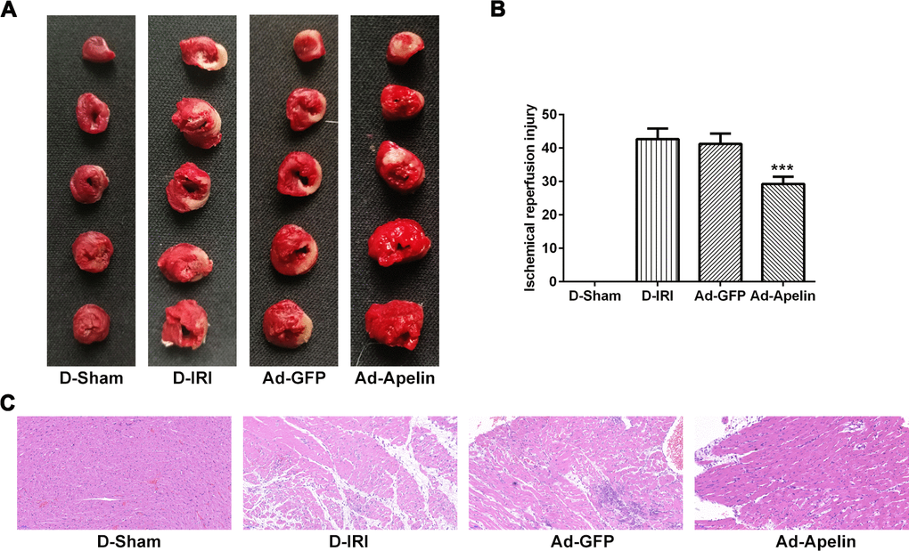 After IRI model and Apelin treatment, the hearts were rinsed off the blood, and subsequently immobilized for 48 h. The heart samples were dehydrated using different concentrations of ethanol and embedded in paraffin. The paraffin was cut into slices (5 μm) and stained with HE. IncuCyte™ S3 ZOOM cell imaging system (Essen BioScience, USA) was used to image the staining slices.
