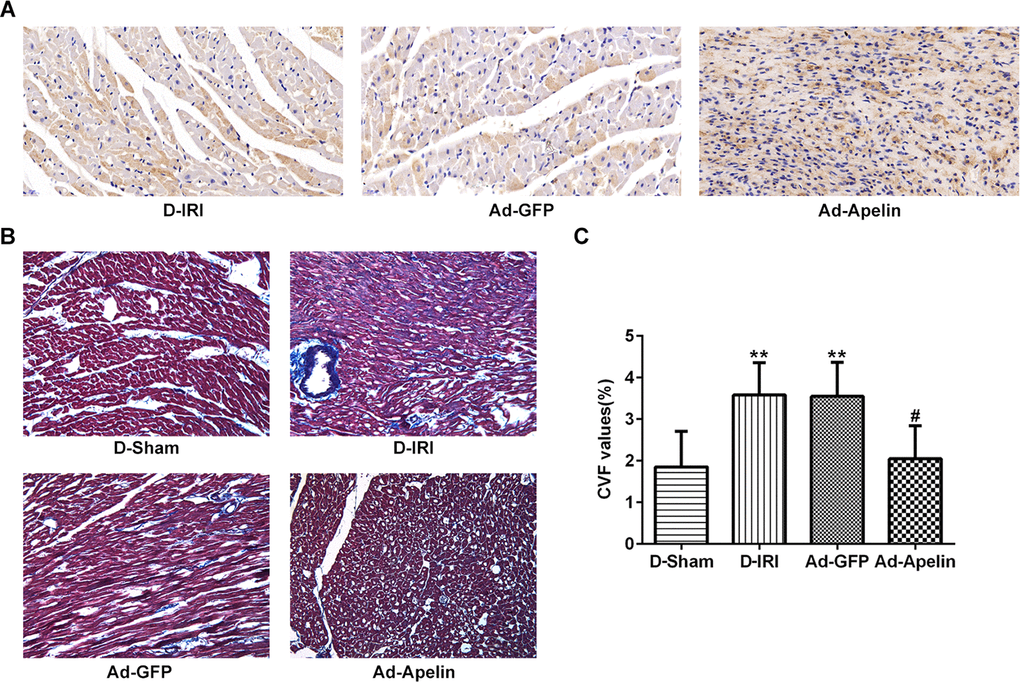 The ultrasonic inspection was performed 6 weeks after surgery. The results unveiled that the LVIDd, LVIDs and LVPWs were significantly higher, whereas the EF and FS were significantly lower in the D-IRI control group and Ad-GFP group compared to the D-Sham group (Table 3). Further, the LVIDd, LVIDs, and LVPWs were significantly lower, and the EF and FS were significantly higher in Ad-Apelin compared to Ad-GFP group (Table 3).