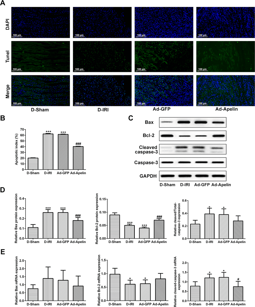 In order to investigate the mechanism of the protective function of Apelin on the myocardial tissues, the apoptosis level and apoptotic biomarkers, such as Bax, Bcl-2 and cleaved caspase-3, were examined by the TUNEL, RT-qPCR and western blot assays, respectively. The TUNEL staining results indicated the reduced apoptotic index in Ad-Apelin group compared to Ad-GFP group (Figure 6A, 6B). The western blot analysis results indicated that the levels of Bax and cleaved caspase-3 were significantly declined, and Bcl-2 levels were significantly elevated compared to the Ad-GFP group (Figure 6C, 6D). Likewise, in RT-qPCR analysis, the decrease of Bcl-2 and increase of cleaved caspase-3 in D-IRI group and Ad-GFP group compared to D-Sham group were viewed, whereas the cleaved caspase-3 expression was inhibited after administration of Ad-Apelin (Figure 6E). Although the gene alteration of Bax and Bcl-2 was not significant in some groups, the increase or decrease trend was similar to protein changes.