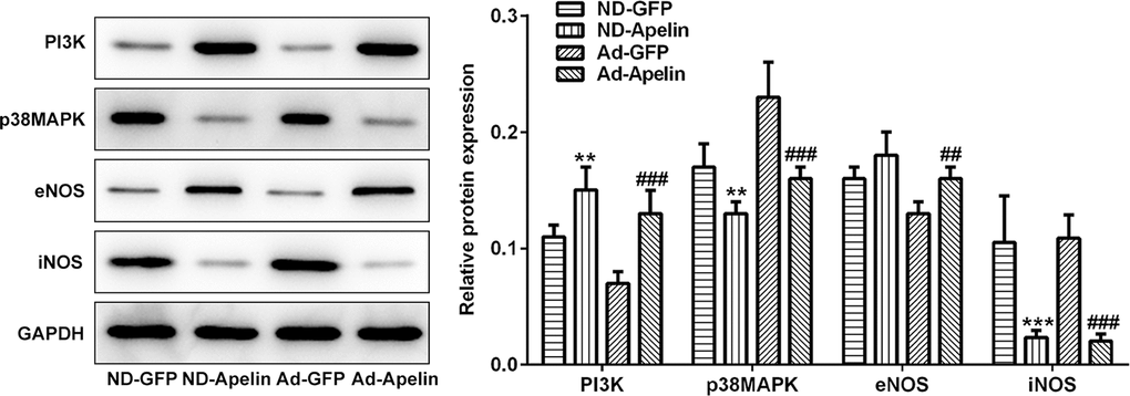 To clarify the specific pathway by which the Apelin protected against the IRI, the PI3K, p38MAPK, eNOS and iNOS expression levels were examined using the western blot assay (Figure 7). The PI3K levels were significantly enhanced in Apelin group compared to the GFP group. Furthermore, the p38MAPK and iNOS expression was repressed in Apelin group compared to GFP group.