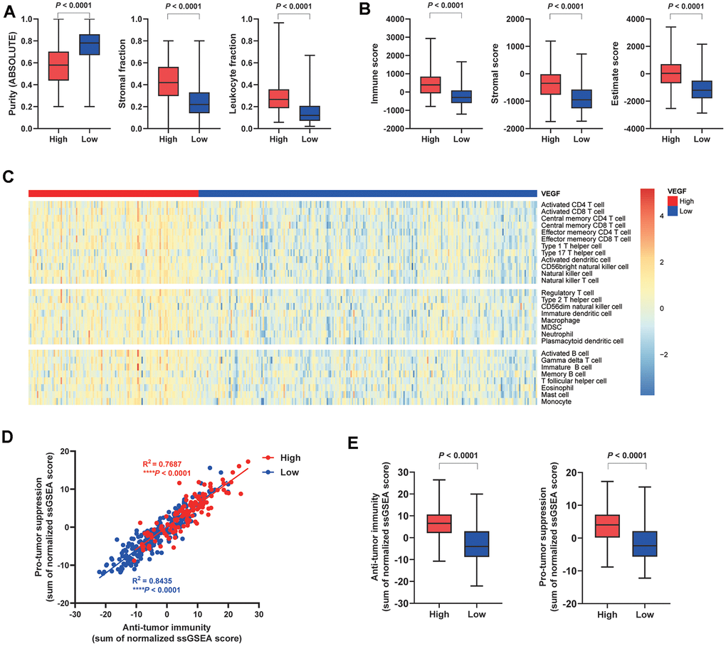 Based on the published data from the TCGA group, we compared the tumor purity and the stromal fraction between the high and the low VEGF score subtype. This revealed a significantly lower tumor purity and higher stromal fraction in the high VEGF score subtype (P < 0.0001) (Figure 1A). More importantly, the high VEGF score subtype exhibited a significantly higher leukocyte fraction (P < 0.0001) (Figure 1A). Based on the ESTIMATE results, we found that the high VEGF score subtype had a significantly higher immune score, stromal score, and Estimate score (all with P < 0.0001) (Figure 1B). Infiltration of 28 immune cell types was estimated for each by using ssGSEA scores. scores. Compared with the low VEGF score subtype, the high VEGF score subtype had relatively higher immune cell infiltration, including cells contributing to anti-tumor immunity (e.g., activated CD8+ T cells, type 1 T helper cells, and natural killer cells) and cells contributing to pro-tumor suppression (e.g., regulatory T cells, immature dendritic cells, and myeloid-derived suppressor cells, MDSCs) (Figure 1C). For each VEGF score subtype, Spearman’s correlation test suggested a positive association between these two categories of immune cells in the local tumor microenvironment (Figure 1D). The high VEGF score group exhibited both higher anti-tumor immunity and pro-tumor suppression (Figure 1E).
