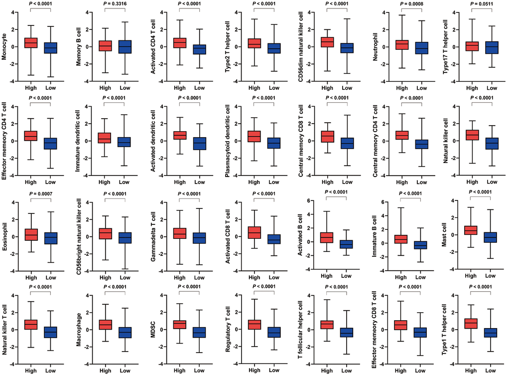 For specific immune cell types, the high VEGF score subtype had significantly higher infiltration of 26 immune cell types (except for memory B cells and type17 T helper cells) (Figure 2). Spearman’s correlation tests also indicated positive correlations between VEGF signaling pathway ssGSEA scores and the ssGSEA scores of 28 immune cell types (Supplementary Figure 1). Although the absolute levels of immune cells varied between the two VEGF score subtypes, the relative cell fractions of most immune cells estimated by the CIBERSORT algorithm appeared to be similar (Supplementary Figure 2A, 2B). Notably, higher fractions of M1 macrophages, M0 macrophages, and gamma delta T cells were observed in the high VEGF score subtype (Supplementary Figure 2A, 2C).