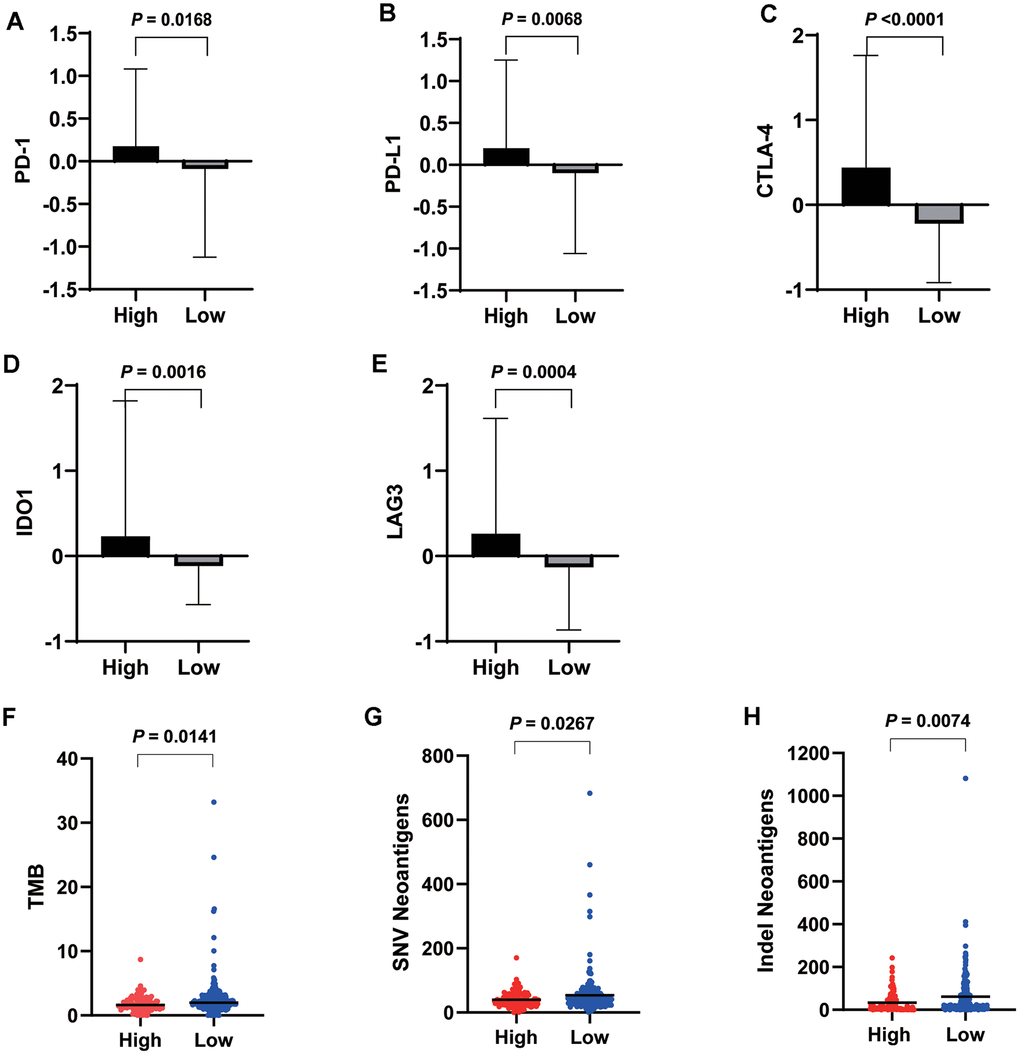 The high VEGF score subtype exhibited higher expression of 66 immune markers associated with immune stimulation or suppression (Figure 3). The correlations between the 66 immune marker expression scores in all patients, patients of the high VEGF score subtype, and patients of the low VEGF score subtypes were investigated by Spearman’s correlation tests and visualized in Supplementary Figures 3–5, respectively. We then focused on several important checkpoint molecules including PD-1, PD-L1, CTLA-4, IDO1, and LAG3, and found that the expression levels of these molecules were all significantly higher in the high VEGF score subtype (Figure 4A–4E).