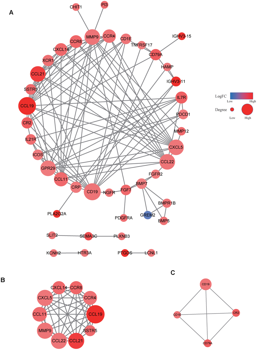 Our data revealed that the expression levels of 66 immune markers, both immune stimulation-related genes and immune suppression-related genes, were higher in the high VEGF score subtype. Notably, immune checkpoint genes, including PD-1, PD-L1, CTLA-4, IDO1, and LAG3, also exhibited significantly higher expression levels in the high VEGF score subtype. This indicated that the tumor was more likely to be responsive to ICB treatments in high VEGF score subtype. Additionally, the high VEGF score subtype had both lower TMB and neoantigen numbers compared to the low VEGF score subtype, indicating lower genetic instability. High immune infiltration is thought to lower genetic instability by eliminating tumor subclones and inhibiting tumor evolution [34]. On the contrary, insufficient immune infiltration might allow immune escape, leading to tumor evolution and increased genomic instability [34]. Together, these findings suggest that the VEGF high score subtype is more immune inflamed and may be more likely to benefit from ICB treatments. In agreement with previous findings, numerous DEGs between the two VEGF score subtypes were immune-related genes (172 of 495). To comprehensively explore the differences in gene expression profiles, we conducted GO pathway enrichment analysis, which indicated that many immune-related GO terms were ranked top in biological process, cellular components, and molecular functions. Other top GO terms were primarily associated with stromal components (e.g., extracellular matrix, extracellular matrix structural constituent), which was also consistent with the high stromal score in the high VEGF score subtype. The network of the top 20 summary GO terms further indicated the interplay between the immune microenvironment, the development of blood vessels, and the stroma. Additional PPI analysis focused on the immune-related genes revealed two important modules that included 10 genes (including CCL11, CCL19, CCL21, CCL22, CCR4, CCR8, CXCL5, CXCL14, MMP9, and SSTR5) and four genes (including CD1E, CD19, CD79A, and CR2), respectively. The cytokines in the first module primarily display chemotactic activities for miscellaneous immune cells, which explain the higher immune infiltration in the high VEGF score subtype. Genes in the second module were associated with encoding important components of B cells, which are important in humoral immunity.