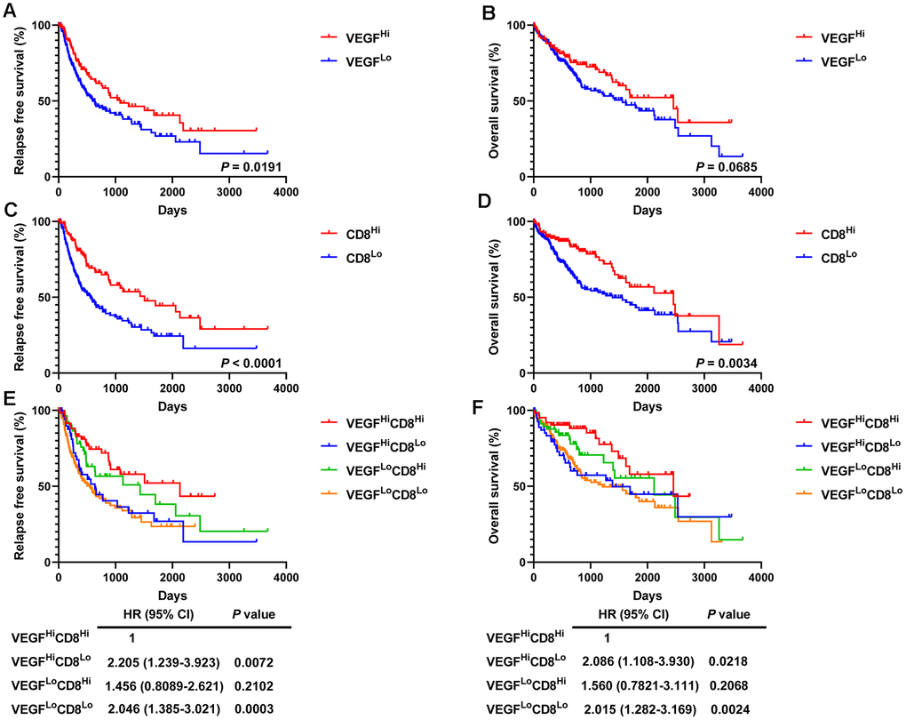 Given the prognostic value of CD8+ T cells in a variety of solid tumors, we then divided the 365 HCC patients into a high activated CD8+ T cell group (CD8Hi, n = 122) and a low activated CD8+ T cell group (CD8Lo, n = 243) based on ssGSEA scores. Compared with the low VEGF score subtype, the high VEGF score subtype had a significantly longer recurrence free survival (RFS, P = 0.0191) and the tendency of a longer OS (P = 0.0685) (Figure 7A, 7B). We also observed significantly better RFS and OS in the CD8Hi group when compared with the CD8Lo group (P < 0.0001 and P = 0.0034, respectively) (Figure 7C, 7D). We then categorized the 365 patients into four groups (VEGFHiCD8Hi, VEGFHiCD8Lo, VEGFLoCD8Hi, and VEGFLoCD8Lo) based on the ssGSEA scores of the VEGF signaling pathway and activated CD8+ T cells. Upon comparing RFS and OS between the groups, both suggested better prognosis in the VEGFHiCD8Hi group compared with the VEGFHiCD8Lo group and the VEGFLoCD8Lo group, but not the VEGFLoCD8Hi group (Figure 7E, 7F).