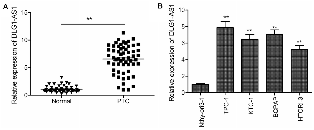 Four PTC cell lines (TPC1, KTC-1, B-CPAP, and HTori-3) and a normal thyroid epithelial cell line (Nthy-ori 3-1) were bought from Cell Bank of Chinese Academy of Science (Shanghai, China). The cells were grown in RPMI-1640 (GIBCO-BRL, CA, USA) supplemented with 10% fetal bovine serum (FBS; GIBCO-BRL), 100 mg/mL streptomycin and 100 U/mL penicillin (Invitrogen; Thermo Fisher Scientific, Inc.). For the downregulation of DLG1-AS1, recombinant lentivirus short-hairpin RNA plasmid directly targeting DLG1-AS1 (sh-DLG1-AS1) and corresponding negative control scramble (sh-NC) plasmids were synthesized by GenePharma (Shanghai, China). TPC-1 cells were transfected with sh-DLG1-AS1 and sh-NC lentiviral transduction particles (MOI = 20) using 5 μg/mL polybrene (GeneChem). Stably transfected cells were obtained using 1 μg/mL puromycin (Calbiochem, USA).