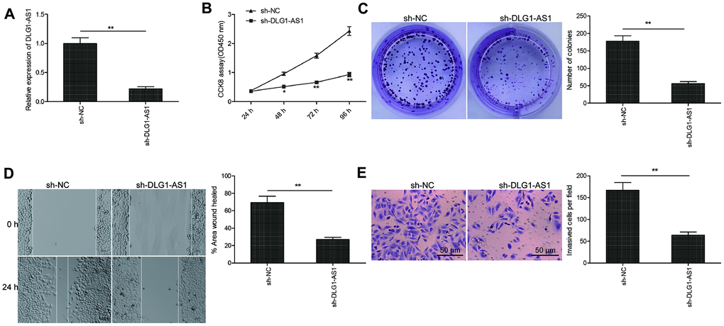 To identify the function of DLG1-AS1 in tumorigenesis, we determined multiple parameters including proliferation, migration, and invasion in TPC-1 (human PTC cell line) cells. Initially, we knocked down DLG1-AS1 in TPC-1 cells by transfecting the cells with shRNA against DLG1-AS1 (sh-DLG1-AS1). The qRT-PCR results confirmed a highly downregulated expression of DLG1-AS1 post silencing in TPC-1 cells (Figure 2A). Next, the CCK-8 and colony formation assays were performed to observe the effect of DLG1-AS1 depletion on the proliferation of PTC cells. The CCK-8 assay demonstrated reduced cell viability of TPC-1 cells at 48, 72, and 96 h following DLG1-AS1 depletion (Figure 2B). Consistent with this result, knockdown of DLG1-AS1 inhibited colony formation ability of TPC-1 cells (Figure 2C). Next, we performed studies to check the migration and invasion capacities of TPC-1 cells transfected with sh-DLG1-AS1. We observed that the knockdown of DLG1-AS1 decreased the migration and invasion abilities of TPC-1 cells (Figure 2D, 2E). These data confirmed that knockdown of DLG1-AS1 inhibited cell proliferation, migration, and invasion of PTC cells.