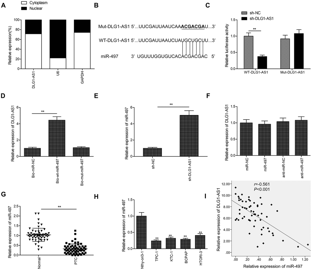 The subcellular localization of an lncRNA represents its biological function. To determine the cellular localization of DLG1-AS1, we isolated the cytoplasmic and nuclear fractions of TPC-1 cells, with glyceraldehyde 3-phosphate dehydrogenase (GAPDH) as the cytoplasmic control and U6 as the nuclear control, respectively. The results of qRT-PCR demonstrated that 71.2% of the DLG1-AS1 was present in the cytoplasmic fraction of TPC-1 cells (Figure 3A). Given that DLG1-AS1 is primarily located in the cytoplasmic fraction of PTC cells, we hypothesized that DLG1-AS1 could serve as a competing endogenous RNA (ceRNA) for sponging miRNAs in PTC. The bioinformatics prediction database (Starbase2.0; http://starbase.sysu.edu.cn/) showed a shared binding site for miR-497 in the DLG1-AS1 molecule (Figure 3B). Based on these binding sequences, we constructed DLG1-AS1-WT and DLG1-AS1-MUT plasmids and performed luciferase activity assays. The results demonstrated that the overexpression of miR-497 decreased the luciferase activity of DLG1-AS1-WT. However, it had no effect on DLG1-AS1-MUT in TPC-1 and B-CPAP cells (Figure 3C). The RNA-pull down assay further confirmed the binding of DLG1-AS1 to miR-497 in TPC-1 cells (Figure 3D). In addition, we found that the knockdown of DLG1-AS1 increased the expression of miR-497 (Figure 3E), whereas the upregulation or downregulation of miR-497 in PTC cells did not alter the expression of DLG1-AS1 (Figure 3F). Furthermore, we found reduced expression of miR-497 in PTC tissues (Figure 3G) and cell lines (Figure 3H). Besides, the expression of DLG1-AS1 reversely correlated with the expression of miR-497 in PTC tissues (Figure 3I). These results showed that miR-497 could bind to DLG1-AS1 in vitro.