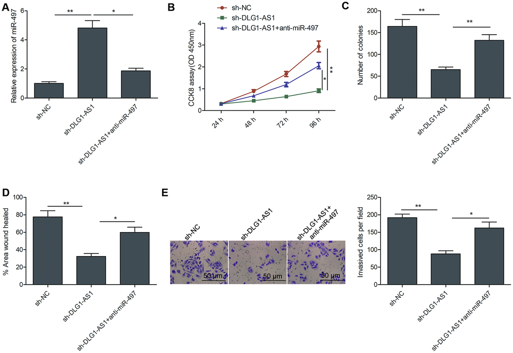 Next, we performed rescue experiments to study the involvement of miR-497 in the effects of DLG1-AS1 on cell proliferation, colony formation, migration, and invasion of PTC cells. The results of qRT-PCR revealed that miR-497 inhibitor decreased DLG1-AS1 depletion-induced expression of miR-497 in TPC-1 cells (Figure 4A). Rescue experiments revealed that the downregulation of miR-497 partially reversed the effect of DLG1-AS1 depletion on cell proliferation, colony formation, migration, and invasion in TPC-1 cells (Figure 4B–4E). These results implied that DLG1-AS1 exerted a tumor-promoting effect on PTC cells by functioning as a ceRNA for sponging miR-497.