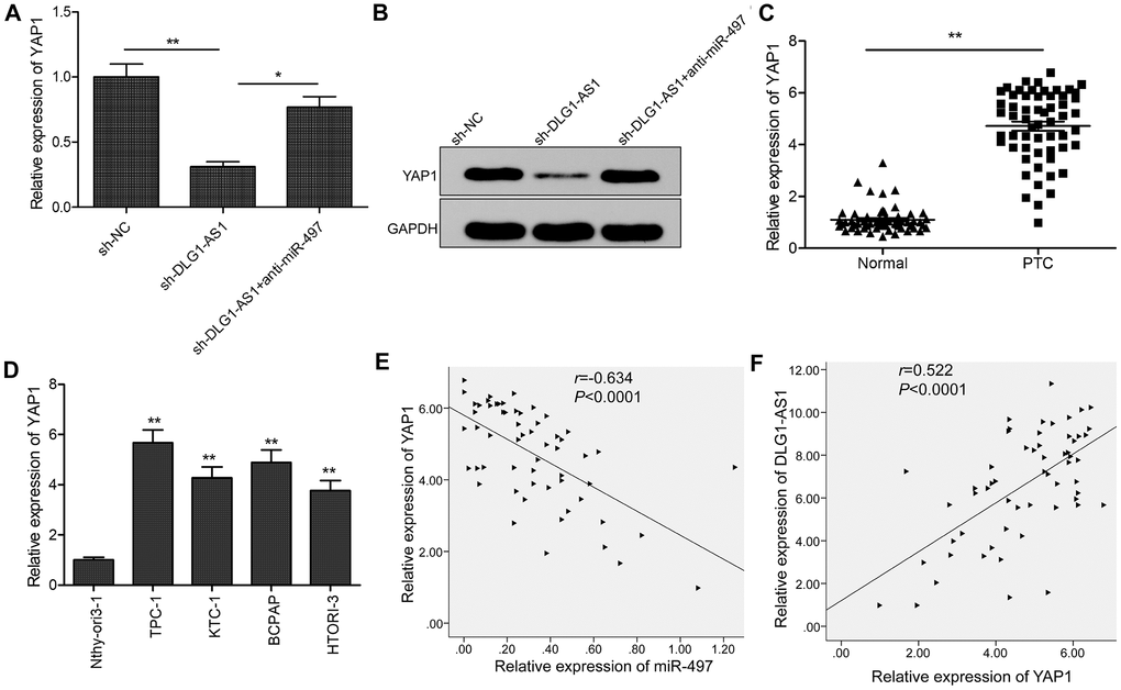 A previous study showed that miR-497 could target YAP1 to inhibit PTC progression [13]. Here, we investigated the association of DLG1-AS1, miR-497, and YAP1. We found that knockdown of DLG1-AS1 inhibited the expression of YAP1 in TPC-1 cells, whereas miR-497 inhibitor could partially rescue this effect (Figure 5A, 5B). Moreover, we found that the expression of YAP1 was upregulated in PTC tissues and cell lines (Figure 5C, 5D). Pearson’s correlation analysis indicated that the expression of YAP1 was negatively correlated with that of miR-497 (Figure 5E) and positively correlated with that of DLG1-AS1 in PTC tissues (Figure 5F). These data indicated that DLG1-AS1 regulated the expression of YAP1 by sponging miR-497 in PTC.