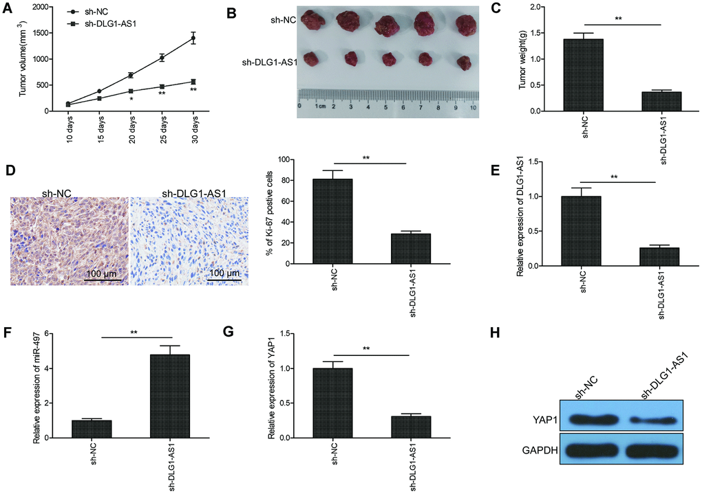 To explore whether the expression of DLG1-AS1 affected tumorigenesis, TPC-1 cells infected with lenti-sh-DLG1-AS1 or lenti-sh-NC were used in a BALB/c nude mouse xenograft model. The data showed delayed tumor growth on days 20, 25, and 30 post lenti-sh-DLG1-AS1 injection in comparison with lenti-sh-NC treatment (Figure 6A). Thirty days after the injection, all mice were sacrificed, and the tumor tissues were stripped and weighed. The weight and size of the tumor were smaller in the lenti-sh-DLG1-AS1 group than in the lenti-sh-NC group (Figure 6B, 6C). Furthermore, immunohistochemistry (IHC) assay showed that mice treated with lenti-sh-DLG1-AS1 had lower expression of Ki-67, a proliferation-specific marker (Figure 6D). To confirm the expression of DLG1-AS1, miR-497, and YAP1 in tumor xenograft, qRT-PCR was performed on tissues at the end of the experiments. Results showed that the depletion of DLG1-AS1 decreased the expression of DLG1-AS1 (Figure 6E), increased the expression of miR-497 (Figure 6F), and reduced that of YAP1 mRNA and protein (Figure 6G, 6H) in xenograft tissues, suggesting that the knockdown of DLG1-AS1 efficiently suppressed tumor growth in vivo by regulating the miR-497/YAP1 axis.