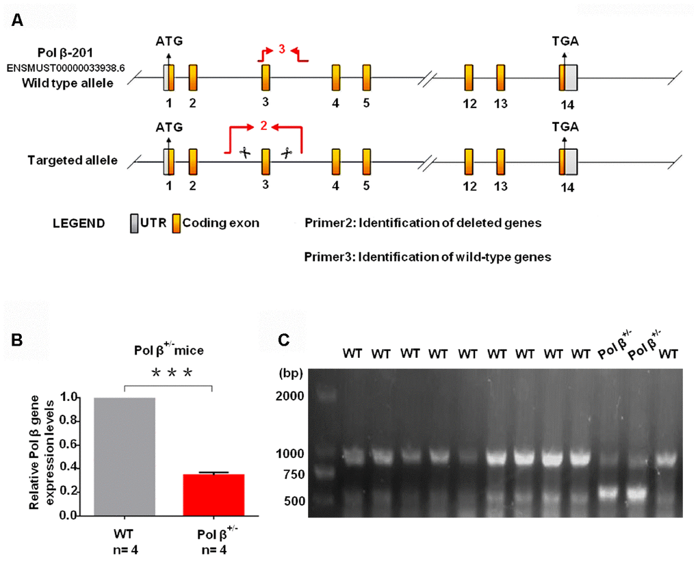 Pol β+/- transgenic animals were selected based on their genotoxic stress sensitivity [16] and obtained from the Model Animal Research Centre of Nanjing University, China. Animals were housed in a standard climate-controlled facility under a 12-hour light/dark cycle. These mice carry a 365 bp deletion in exon 3 (aaaagcggcatctgtgatagccaagtacccacacaaaatcaagagcggagcggaagctaagaaactg) of Pol β (Pol β+/-) induced via CRISPR/Cas9 editing. Homozygous Pol β-/- mice are not viable, dying at embryonic day 10.5, whereas heterozygous Pol β+/- embryos displayed both chromosomal abnormalities and slower post-implantation growth [16].