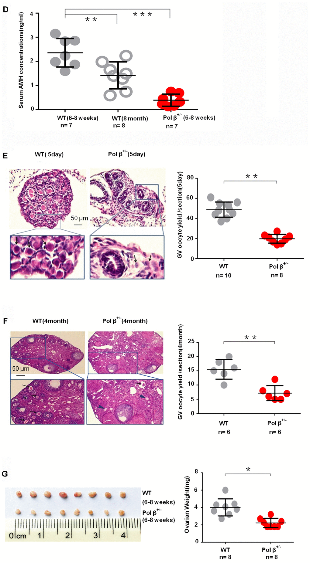 (D) Pol β+/- mice had lower mean serum AMH concentrations than wt mice (aged 6-8 weeks) (n stands for the number of mice, ***P < 0.001, ANOVA). (E) Reduced primordial follicles per ovary (5-day ovary; n stands for the number of mice, **P < 0.01; Student’s t test); the black arrow indicates oocytes. (F) Reduced primordial follicles per ovary (4-month ovary; n stands for the number of mice, **P < 0.01, Student’s t test); the black arrow indicates oocytes; the blue arrow indicates no oocytes. (G) Reduced ovarian weight in Pol β+/- mice (Mice aged 6-8 weeks; n =8 per group; n stands for the number of ovary, *P < 0.05, Student’s t test).