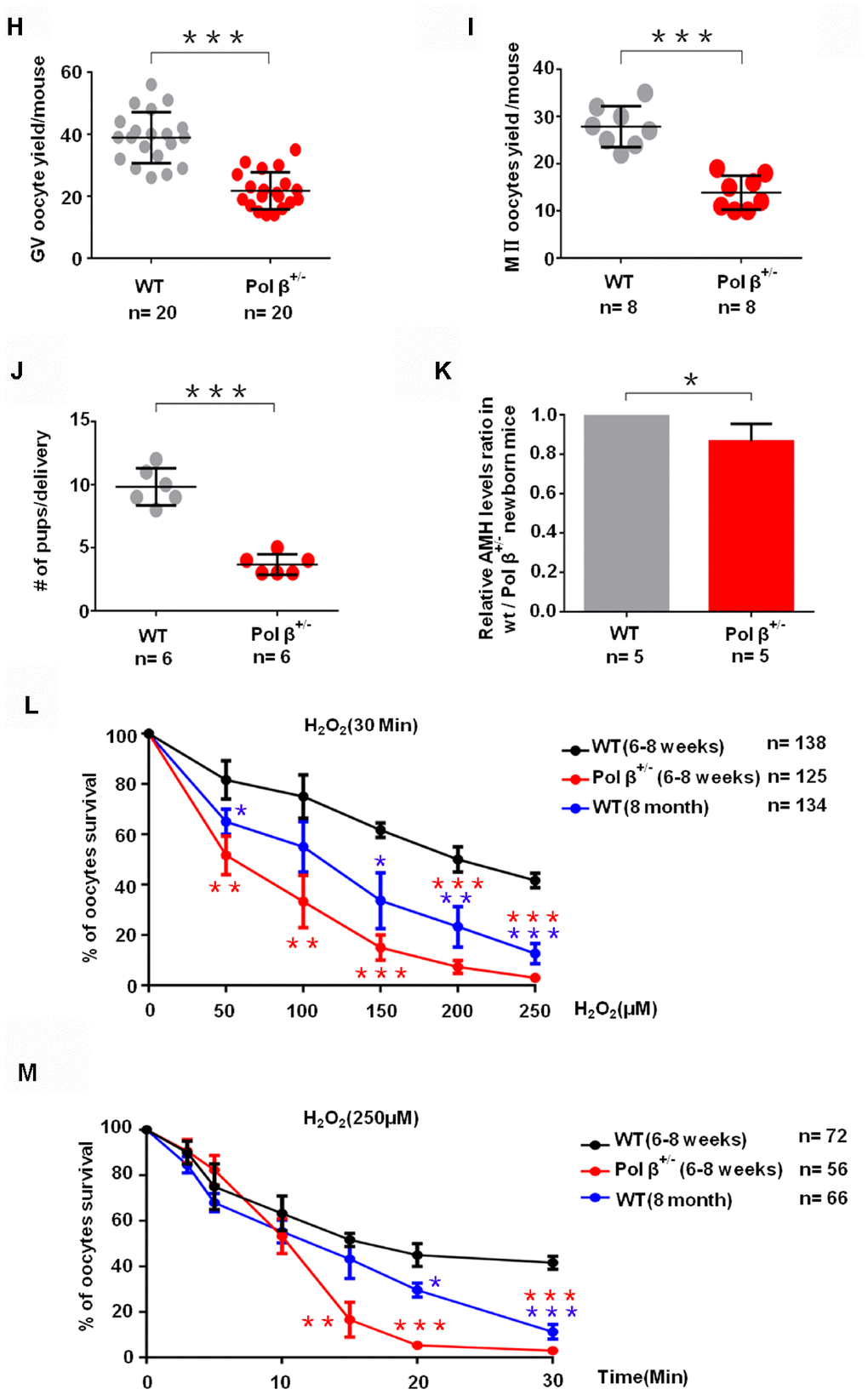 (H) Scatter graphs show a lower number of oocytes yield in Pol β+/- mice compared to wt mice, (Mice aged 6-8 weeks; n =20 per group; n stands for the number of mice, ***P < 0.001, Student’s t test). (I) Pol β+/- mice also showed significantly lower meiosis II (MII) oocyte yield per female than wt mice (Mice aged 6-8 weeks; n =8 per group; n stands for the number of mice, ***P<0.001, Student’s t test). (J) Reduced litter size in Pol β+/- mice (Mice aged 6-8 weeks, n =6 per group; n stands for the number of mice, ***P < 0.001, Student’s t test). (K) In newborn mice, Pol β+/- offspring had lower mean serum AMH concentrations than wt mice (Mice aged 2 weeks, n =5 per group; n stands for the number of mice, *P < 0.05, Student’s t test). (L) Compared to wt (6-8 weeks), Pol β+/- (6-8 weeks) and wt (8 months) oocytes after treatment with different H2O2 concentrations at 30 minutes exhibited different survival (n stands for the number of oocytes, ***P<0.001, **P<0.01, Student’s t test). (M) Compared to wt (6-8 weeks), Pol β+/- (6-8 weeks) and wt (8 months) oocytes after treatment with same H2O2 concentration exhibited different survival (n stands for the number of oocytes, ***P<0.001, ***P<0.001, Student’s t test).