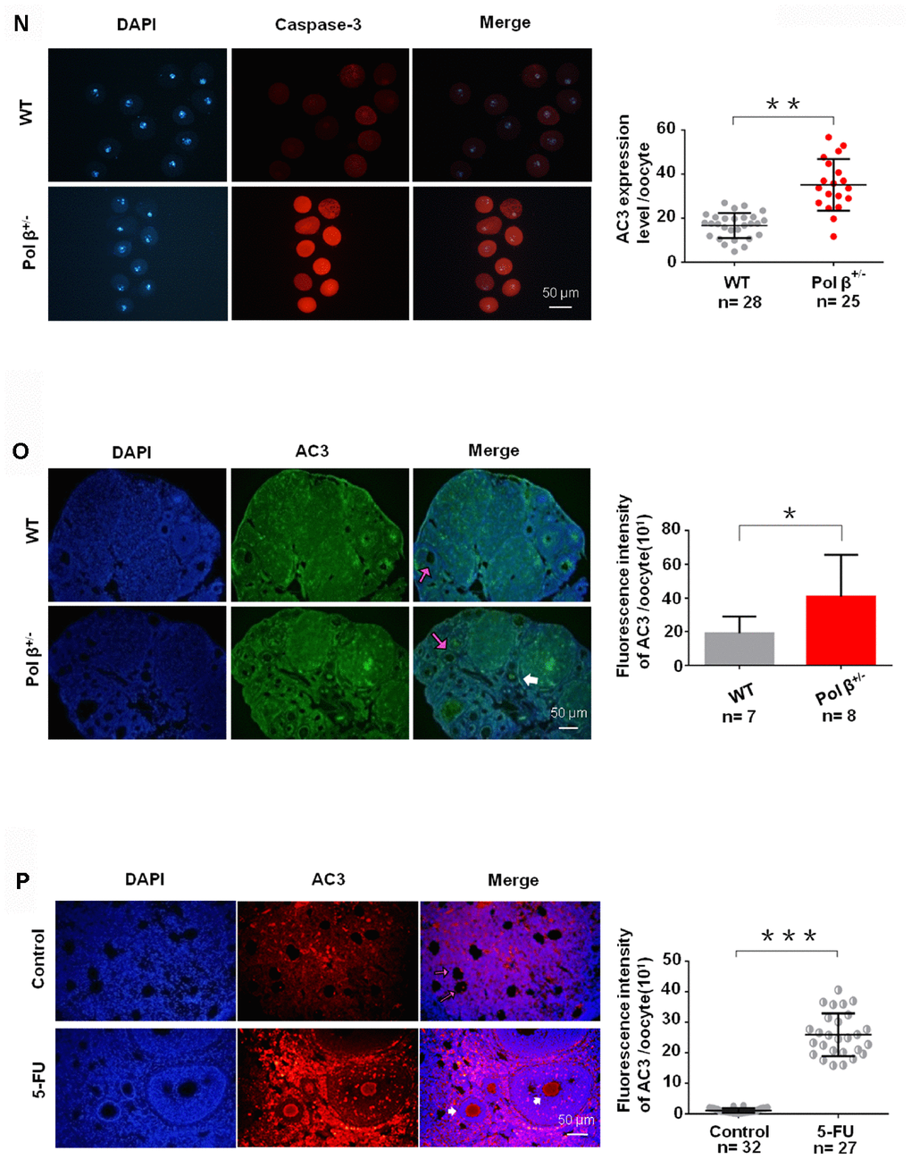 (N) Pol β+/- (6-8 weeks) and wt (6-8 weeks) oocytes were immunofluorescent for AC3. Pol β+/- showed a significant increase in AC3 fluorescence intensity compared to wt (n stands for the number of oocytes, **P<0.01, Student’s t test). (O) Pol β+/- (6-8 weeks) ovarian tissue showed a higher AC3 fluorescence intensity (n stands for the number of oocytes, *P < 0.05, Student’s t test). The pink arrow indicates normal oocytes; the white arrow indicates apoptotic oocytes. (P) 5-FU treatment results in ovarian tissue with greater AC3 fluorescence intensity (mice aged 6-8 weeks, n stands for the number of oocytes, ***P <0.001, Student’s t test). The pink arrow indicates normal oocytes; the white arrow indicates apoptotic oocytes (mice injected with 5-FU for 2 weeks under the safe dose of 20 mg/kg every day, Student’s t test). All scatter graphs and bar graphs show the means ± SD.