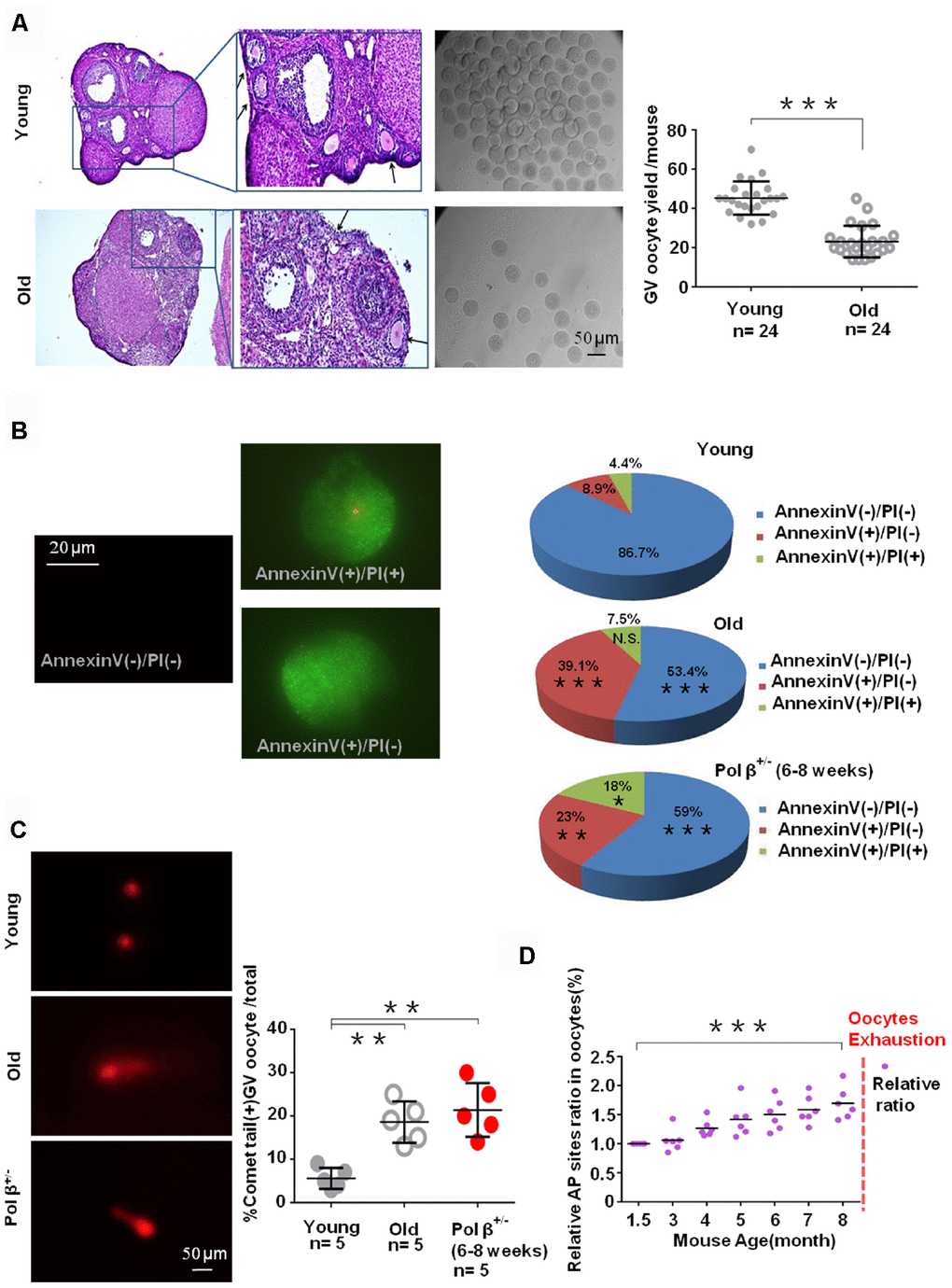 Pol β deficiency leads to oocyte apoptosis, and age leads to a decrease in the ovarian reserve. However, whether Pol β deficiency is related to ovarian aging or not, it is still unknown. C57BL/6J mice, with clearly reduced ovarian reserves over eight months of age (old) compared to 6-8 weeks of age (young), were used to test this hypothesis. Eight months old C57BL/6J mice corresponding to women in the late third decade of reproductive lifespan when both the quantity and quality of oocytes occurred markedly decrease [19].