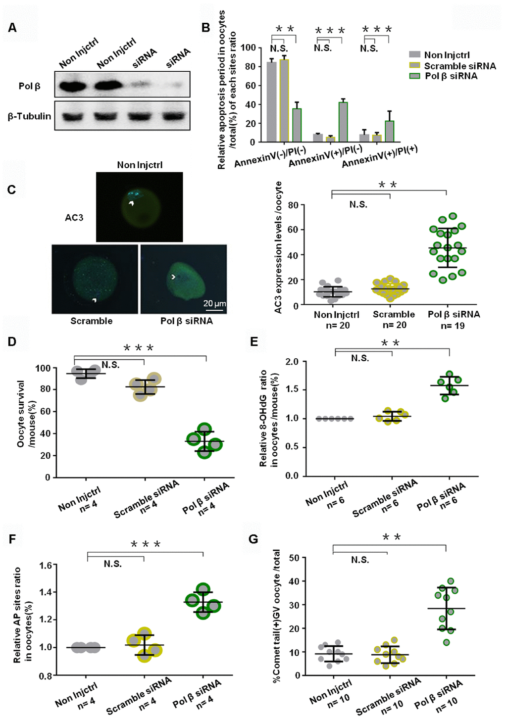 To assess the specific role of Pol β in oocytes and to analyze the importance of BER in protecting oocyte genomic integrity and survival, we injected the young murine oocytes with small interfering RNA (siRNA) targeting Pol β and the “All Stars Negative Control siRNA” as a negative control. Western blotting (WB) confirmed that oocytes with Pol β siRNA showed downregulated Pol β expression (Figure 4A). Annexin V-FITC/propidium iodide (PI) immunofluorescence identified oocytes undergoing Pol β siRNA-induced apoptosis. Immunofluorescence analysis showed a marked decrease in normal oocytes and a significant increase in apoptotic oocytes (Figure 4B; P<0.01, P<0.001 and P<0.001, respectively). Genotoxic stress then induced in these siRNA-treated oocytes via H2O2 treatment. All oocytes with siRNA-downregulated gene expression exhibited a significantly increased fluorescence intensity of AC3 after H2O2 treatment than scramble siRNA-treated oocytes, indicating that interference with Pol β results in an increased apoptotic signaling activity in oocytes (Figure 4C; P<0.01). After 24 hours, oocytes treated with Pol β siRNA exhibited a lower survival rate than the non-injection control (non-injctrl) or scramble siRNA treated oocytes (Figure 4D; P<0.001). Figure 4E (Figure 4E; P<0.01), shows a significant increase in 8-OHdG observed in Pol β siRNA-treated oocytes compared to non-injctrl or scramble siRNA-treated oocytes, causing DNA lesion accumulation at the intracellular level. Figures 4F and 4G show significant increases in the AP sites and percentages of comet tails in Pol β siRNA-treated oocytes compared to non-injctrl or scramble siRNA-treated oocytes, suggesting that interference with Pol β results in increased DNA damage at the intracellular level (Figure 4F and 4G; P<0.001, P<0.01, respectively). These results revealed that the Pol β-related DNA BER pathway is critical for oocyte survival. Almost all non-injctrl oocytes survived under the identical conditions.