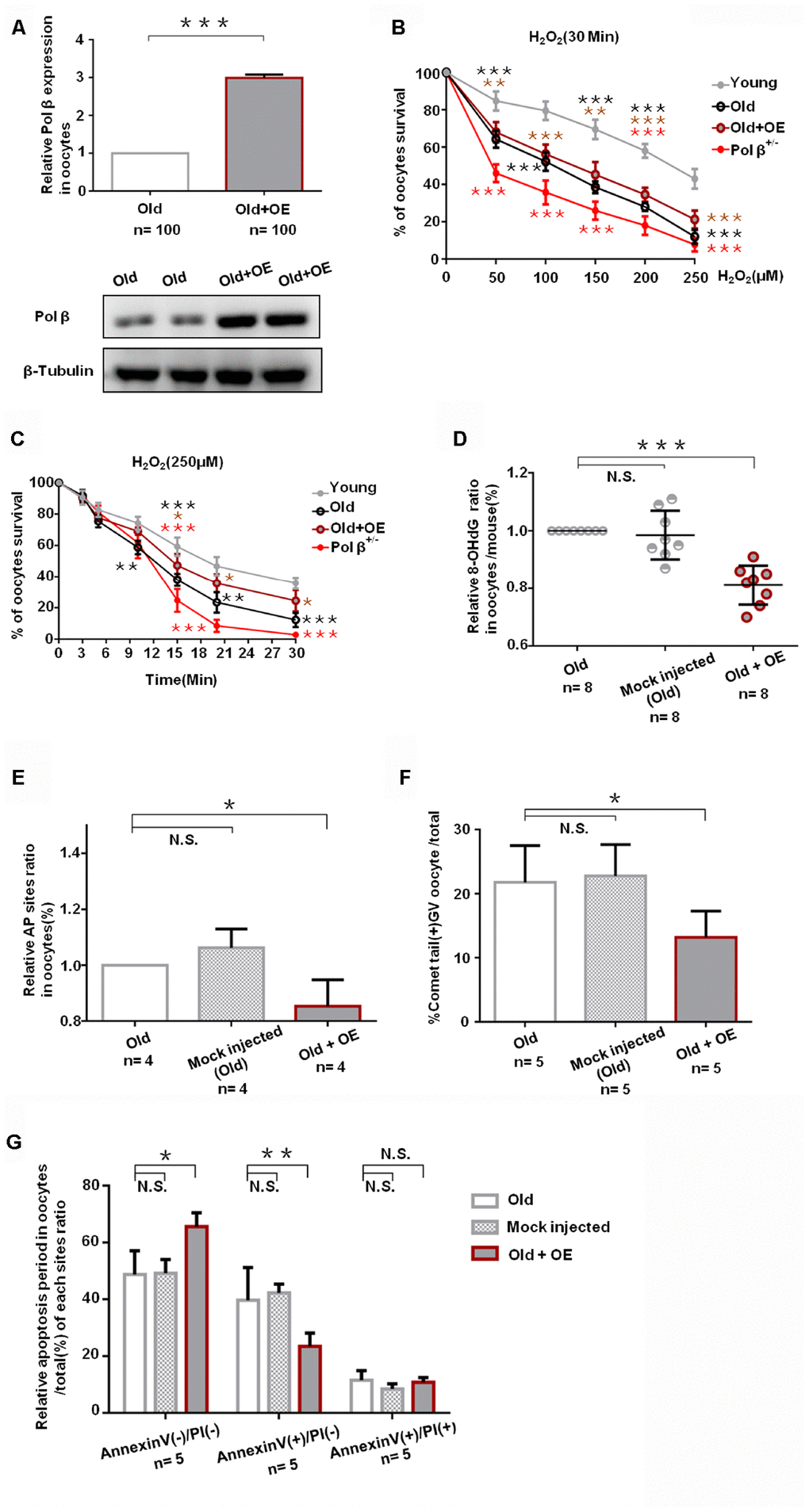 We exposed mock-injected (injected with empty plasmid) and Pol β complementary DNA (cDNA) -injected oocytes from aged murine to H2O2 in order to test whether Pol β overexpression (OE) increases genotoxic stress resistance or not. Oocytes from Pol β-OE mice showed more Pol β gene expression than wt mice by QPCR and WB (Figure 5A; P<0.001), and Pol β-OE oocytes showed a significant increase in oocyte survival after treatment with different concentrations of H2O2 (Figure 5B; P<0.001). Also, Pol β-OE oocytes exhibited a significant increase in oocyte survival after treatment with the same concentration of H2O2 for different lengths of time (Figure 5C; P<0.05). A decrease in 8-OHdG was observed in Pol β-OE oocytes compared to old or mock-injected oocytes, suggesting that Pol β-OE enhances BER to resist DNA oxidative damage (Figure 5D; P<0.001). Figures 5E and 5F show significant decrease in AP sites and percentages of positive comet oocytes in Pol β-OE oocytes compared to old or mock-injected oocytes (Figure 5E; P<0.05, 5F; P<0.05, respectively). These results showed a significant increase in normal oocytes and a significant decrease in apoptotic oocytes, suggesting that restoration of the Pol β function may prolong the life time of aging oocytes (Figure 5G; P<0.05, P<0.01, respectively).