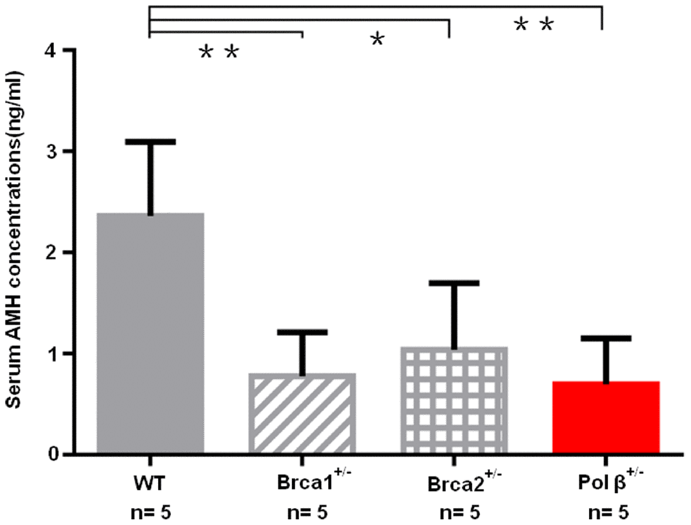 Because breast cancer 1 (Brca1) and breast cancer 2 (Brca2) associates with ovarian aging [5, 23], we prospectively compared serum AMH concentrations in wt mice, Brca1+/- mice, Brca2+/- mice and Pol β+/- mice at the same age. Pol β+/- mice displayed significantly lower serum concentrations of AMH than wt mice, but similar serum concentrations of AMH with Brca1+/- mice and Brca2+/- mice (Figure 6; P<0.01, P<0.01 and P<0.05, respectively).