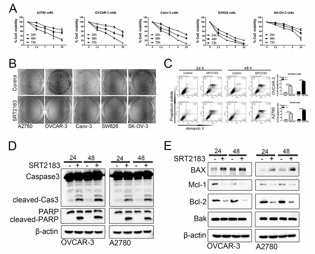 SRT2183 has been demonstrated to inhibit cell growth and induce cellular demise of malignant lymphoid, glioblastoma and malignant bone tumor [8–10]. However, it remains unclear whether SRT2183 impairs the ovarian cancer cells.
