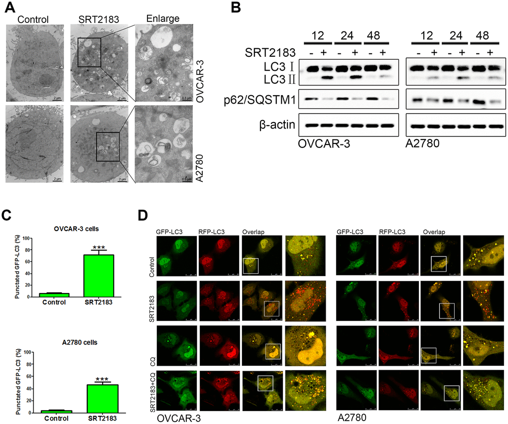 In order to evaluate if and how SRT2183 regulates the level of autophagy, the OVCAR-3 and A2780 cells were incubated by 1 μM SRT2183 and the autophagosome was evaluated by transmission electron microscopy. We observed that SRT2183 decreased the level of autophagosomes, when compared to the cells treated by vehicle (Figure 2A). In addition, the level of autophagy was evaluated by LC3 and p62/SQSTM1 western blot. We found that SRT2183 increased the level of LC3II, however, it decreased the accumulation of p62/SQSTM1 (Figure 2B). In addition, the SRT2183-treated cells induced a significant increase in microscopy-based GFP-LC3 puncta, when compared to vehicle cells (Figure 2C). Moreover, compared to vehicle-treated cells, 1 μM SRT2183-treated cells had more red dots (autolysosomes, Figure 2D). As expected, adding 5 μM chloroquine (CQ), a traditional inhibitor of autophagy, increased the number of yellow dots (autophagosomes, Figure 2D) in OVCAR-3 and A2780 cells. Taken together, these results indicated that SRT2183 induced autophagy in ovarian cancer cells.