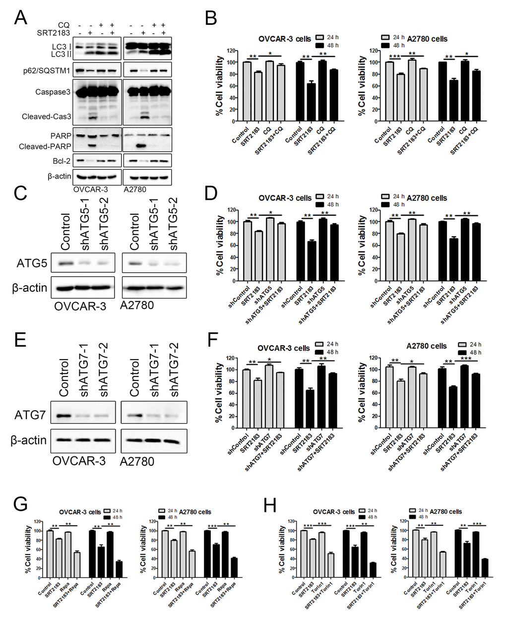 In order to verify if the anti-cancer effect of SRT2183 is dependent on the autophagy, we knocked down autophagy related 5 (ATG5) and autophagy related 7 (ATG7), two master regulators of autophagy, by shRNA-lentivirus. Indeed, the shRNA-lentivirus decreased the level of ATG5 in OVCAR-3 cells and A2780 cells (Figure 3C). Knocking down ATG5 in combination with SRT2183 significantly increased the cell viability when compared to SRT2183 treated cells (Figure 3D). Similar results were observed when the ATG7 was knocked down (Figure 3E, 3F). This suggested that SRT2183 inhibited cell growth by inducing autophagy. In order to justify if the induce of autophagy enhances the anti-proliferation effect of SRT2183, we treated OVCAR-3 and A2780 cells with 1 μM SRT2183, or the autophagy inducers (0.1 μM rapamycin or 0.05 μM torin 1), or the combinational therapy as indicated in Figure 3E, 3F. We observed that 0.1 μM rapamycin or 0.05 μM torin 1 did not significantly reduce the cell viability (Figure 3G, 3H).