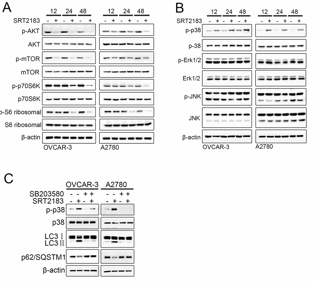 In order to reveal the mechanism of how SRT2183 induces autophagy, we evaluated the Akt/mTOR/70s6k pathway and p38 MAPK signaling pathway, two traditional pathways of autophagy. A significant decrease in the phosphorylation of Akt, mTOR and p70S6K in both OVCAR-3 and A2780 cells was observed after these cells were treated by SRT2183 for 12 h, 24 h, or 48 h (Figure 4A). However, no significant decrease in Akt, mTOR, and p70S6K (Figure 4A) was observed. These results suggested that Akt/mTOR/70s6k pathway, a traditional signaling pathway of autophagy, was activated by SRT2183. To investigate if the MAPK signaling pathway is involved in the SRT2183-mediated autophagy, the expression level of p-p38, p-ERK and p-JNK was evaluated. SRT2183 increased the level of p-p38, whereas it did not influence the level of p-ERK and p-JNK (Figure 4B). In addition, the OVCAR-3 cells and A2780 cells were treated by 5 μM SB203580, a traditional inhibitor of p38 MAPK signaling pathway. We observed that compared to SRT2183, SB203580 in combination with SRT2183 inhibited the activity of p38 and theSRT2183-mediated autophagy (Figure 4C). This suggested that p38 MAPK signaling pathway might also be involved in the SRT2183- mediated autophagy.
