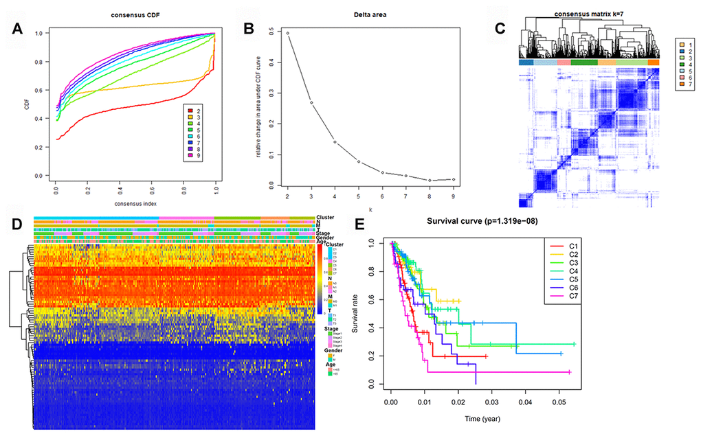 To determine DNA methylation-based clusters of LUAD, we performed an unsupervised hierarchical cluster analysis of patients with LUAD. Depending on the category number, the average cluster consensus and the coefficient of variation among clusters were calculated. We found that most samples in clusters 6 and 7 were stable (Figure 1A). Finally, the optimal cluster number assessed by the cumulative distribution function (CDF) delta area curve was 7 (Figure 1B). Therefore, we divided the samples into seven molecular subtypes. As shown in Figure 1C, a consensus matrix was used to identify the optimal number of clusters. The seven distinct clusters showed different DNA methylation profiles (Figure 1D). The Kaplan-Meier survival analysis revealed that DNA methylation affected the prognosis of patients with LUAD (Figure 1E).