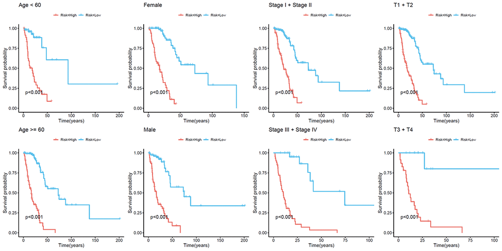 Because cluster 7 had the poorest prognosis and numerous CpG sites, we selected it as the seed cluster. DNA methylation profiles based on these 33 specific sites were measured for all samples, and we subsequently used them to calculate the risk score of each patient with LUAD. The optimal cut-off for dividing patients into high- or low-risk methylation group was set at 0.254 using the time-dependent receiver operating characteristic (ROC) curve analysis (Supplementary Figure 1). Figure 2A–2C display methylation profiles and risk score distribution. The Kaplan–Meier analysis showed that patients in the high-risk group had worse overall survival than those in the low-risk group (p < 0.001; Figure 2D). We next performed a ROC analysis to examine the specificity and sensitivity of the prognostic model. The time-dependent area under the curves (AUCs) for 1-, 3-, and 5-year overall survival rates of patients with LUAD using the prognostic model were 0.901, 0.868, and 0.850, respectively (Figure 2E). A higher AUC indicated better performance for LUAD-specific survival; thus, our data suggested excellent performance for survival prediction. To determine the reliability of the methylation model as a prognostic biomarker, patients with LUAD were stratified into different subgroups based on the following clinical characteristics: (1) age (age < 60 and age ≥ 60 years), (2) sex (male and female), (3) stage (Stage I + Stage II and Stage III + Stage IV), and (4) T stage (T1 + T2 and T3 + T4). Kaplan–Meier overall survival curves also showed that high-risk patients had shorter overall survival than low-risk patients in different subtyes, further indicating the excellent predictive ability of the methylation model (Figure 3).