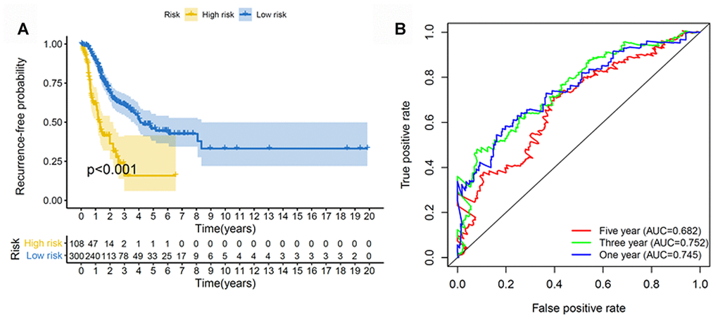Univariate and multivariate Cox regression analyses were further performed to examine whether the recurrence model was independent of other clinical properties. Cox regression analyses revealed the recurrence model to be significant (p < 0.001; Figure 9C). Next, a nomogram that integrated the risk score and clinical risk factors was constructed, in which the risk score for the recurrence model demonstrated good accuracy for predicting 1-, 3- and 5-year disease-free survival rates of patients with LUAD (Figure 9D).