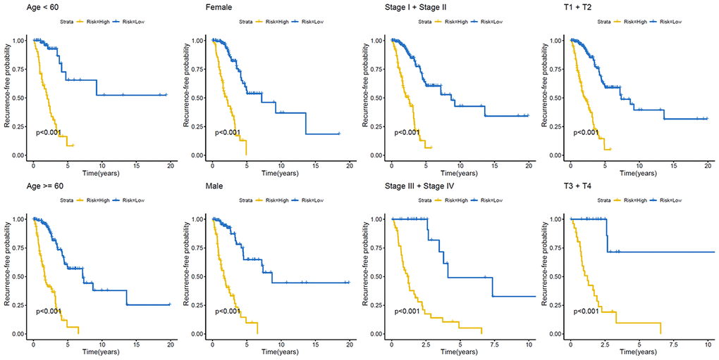We next constructed a recurrence model using specific methylation sites and disease-free survival time and recurrence status in the dataset from HM450K bead array. When compared with patients in the low-risk group, those in the high-risk group had an elevated recurrence rate (p < 0.001) (Figure 4A). The recurrence model resulted in an AUC of 0.682, 0.752, and 0.745 for 1-, 3-, and 5-year disease-free survival time, respectively (Figure 4B). These results verified the predictive accuracy of the recurrence model. Further, these results validated the moderate sensitivity and specificity of the prognostic model. Next, we used this recurrence model to stratify patients with LUAD based on their clinical characteristics such as age, sex, stage, and T stage subgroups (Figure 5).