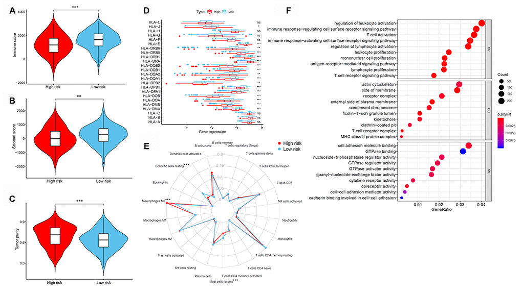 Next, differences in immune cell infiltration of tumor microenvironment were studied in patients with high- and low-risk LUAD. The Estimation of STromal and Immune cells in MAlignant Tumor tissues using Expression data (ESTIMATE) algorithm revealed that the immune and stromal scores were higher in patients in the low-risk group than those in the high-risk group (Figure 6A and 6B). Moreover, we compared the tumor purity of the three LUAD subtypes and found opposite trends—patients in the high-risk group ranked higher than those in the low-risk group (Figure 6C). Because of their clinical implications in immunotherapy, we investigated any potential correlation between the LUAD subtypes and the expression of human leukocyte antigen (HLA) genes. Interestingly, patients in the low-risk group reported higher expression of the majority of HLA genes than those in the low-risk group (Figure 6D). We next evaluated the differences in immune infiltration of 22 immune cell types between the two groups using the CIBERSORT method in association with the LM22 model matrix. Compared with the high-risk group, patients in the low-risk group had a higher number of resting dendritic cells and a lower number of monocytes and resting mast cells (Figure 6E). To study the biological characteristics of differentially expressed genes between high- and low-risk patients with LUAD, we conducted gene ontology (GO) enrichment analyses. We found differentially expressed genes to be clustered and mostly enriched in immune functions, such as antigen receptor-mediated signaling pathways, immune response-regulating cell surface receptor signaling pathways, immune response-activating cell surface receptor signaling pathways, regulation of lymphocyte activation, and T cell activation (Figure 6F).