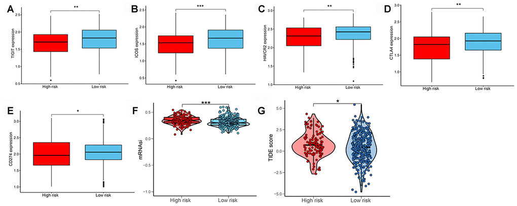 We subsequently determined the expression of several key immunomodulators, including TIGIT, ICOS, TIM-3 (HAVCR2), CTLA4, and PD-L1 (CD274) to study the immunotherapeutic response. As shown in Figure 7A–7E, low-risk patients had higher expression of immune checkpoint molecules than high-risk patients. Cancer stem cells are vital for cancer growth, metastasis, and recurrence, and contribute to the resistance of tumors to conventional radiation therapy and chemotherapy. We used a one-class logistic regression (OCLR) machine-learning algorithm to calculate the tumor mRNA expression-based stemness index (mRNAsi). We observed that patients with the high-risk LUAD subtype had elevated stemness indices compared with those in the low-risk group (Figure 7F). Next, we used the Tumor Immune Dysfunction and Exclusion (TIDE) algorithm to predict the likelihood of the response to immunotherapy. Interestingly, we found that patients in the low-risk group were more likely to respond to immunotherapy than those in the high-risk group (Figure 7G). These data further supported our finding that patients with low-risk LUAD subtype had better prognosis and might respond well to immunotherapies.