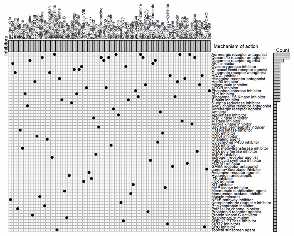 We next identified 82 compounds as potential drugs targeting the methylation signatures. The mode-of-action (MoA) analysis of these compounds revealed 59 shared mechanisms of action (Figure 8). The analysis using predictive databases, i.e., CMap and GDSC revealed that five drugs (phenoxybenzamine, terazosin, timolol, dihydroergocristine, and nadolol) shared the MoA of an adrenergic receptor antagonist, five drugs (levomepromazine, trifluoperazine, chlorpromazine, mesoridazine, and pimozide) shared the MoA of a dopamine receptor antagonist, and three drugs (lisuride, quinpirole, and bromocriptine) shared the MoA of a dopamine receptor agonist. Thus, we identified drugs that targeted different methylation profiles in patients with LUAD and could be used for further analysis.