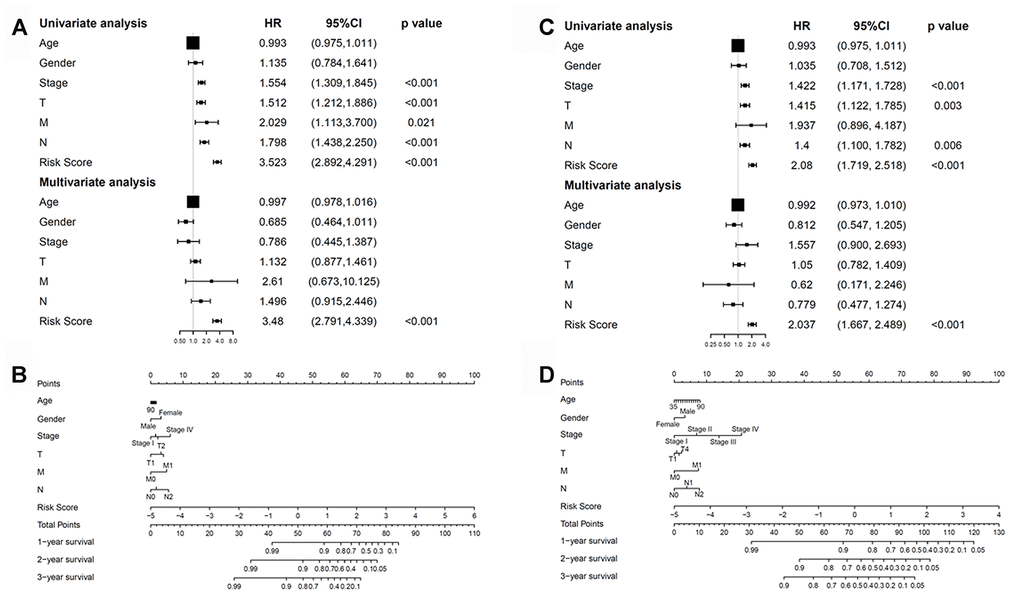 We next checked whether the prognostic model was independent of other conventional clinical properties. Univariate Cox regression analysis revealed that the tumor/node/metastasis (TNM), T, M, and N stages and the risk score correlated with poor survival. Multivariate Cox regression analysis revealed risk score as a specific prognostic indicator for LUAD (p < 0.001; Figure 9A). Subsequently, a nomogram integrating the seven factors was constructed for predicting 1-, 3- and 5-year overall survival rates. Compared with the clinical properties, the risk score for the prognostic model displayed superior predictive performance in the nomogram (Figure 9B).