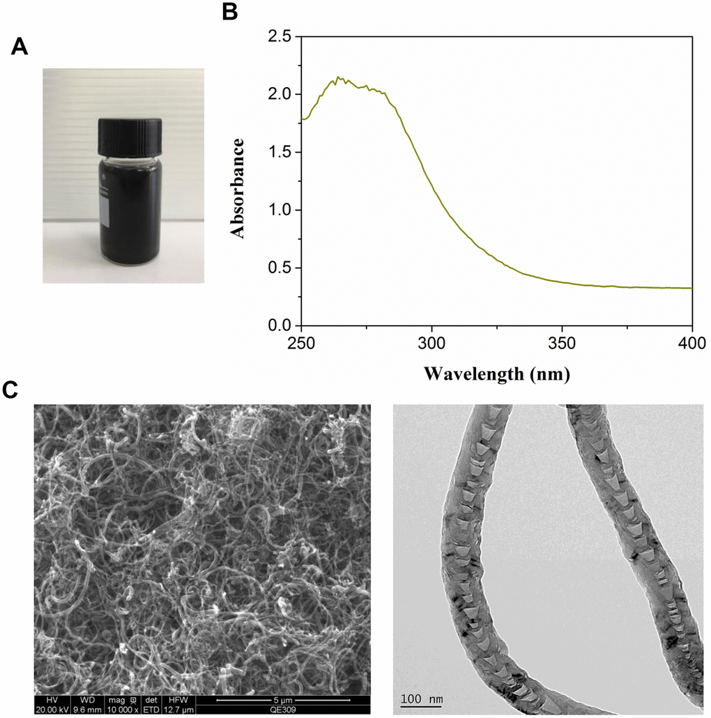 Commercial MWCNT dispersion exhibited black appearance (Figure 1A). The optical absorption spectra of MWCNT revealed around 260 nm of absorption peaks (Figure 1B). TEM images showed the complete and visible tubular structure (Figure 1C).