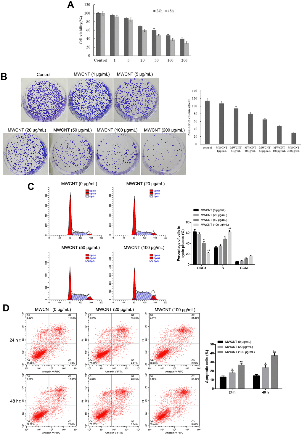 MTT assay showed that MWCNT significantly inhibited cell viability in dose-dependent manner both at 24 and 48 h, and MWCNT with a dose of less than 100 μg/mL showed more than 50% of cell viability (Figure 2A). Another ovarian cancer cell line A2780 and used MTT to detect the effect of different concentrations of MWCNTs on cell viability. Consistently, colony formation results also revealed that compared with control cells, the clone number was obviously decreased in SKOV3 cells with MWCNT in dose-dependent manner (Figure 2B). In addition, flow cytometry analysis found that MWCNT treatment prominently reduced the cell number of G0/G1 phage, while increased cell number of S phage in dose-dependent manner (p < 0.05, Figure 2C). Meanwhile, the rate of apoptotic cells was remarkably increased after MWCNT treatment in dose-dependent manner at 24 h in SKOV3 cells compared with control cells (p < 0.05, Figure 2D).
