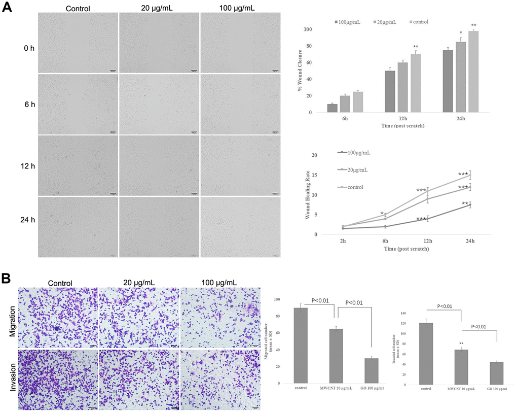 Wound healing assay showed that MWCNT significantly decreased the wound closure and inhibited wound healing rate of SKOV3 cells in dose- and time-dependent manner (p < 0.05, Figure 3A), suggesting a reduced migration potential after MWCNT treatment in SKOV3 cells. Transwell assay also revealed that cell migration and invasion were dramatically inhibited in SKOV3 cells treated with MWCNT compared with control cells (p < 0.05, Figure 3B).