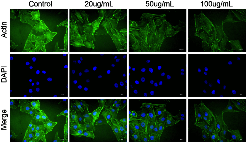 SKOV3 cells were inoculated on cover slips, and then exposed to 0, 20, 50 and 100 μg/mL of MWCNT, respectively, for 24 h. The cells were then subjected to fixation using 4% paraformaldehyde and permeabilized treatment by 0.1% Triton X-100. Followed by blockage by 2% bovine serum albumin, the cells were stained with FITC-Phalloidin (actin, green) and DAPI (nucleus, blue), in turn. Finally, cell images were obtained using laser scanning confocal microscope (Olympus, Japan).
