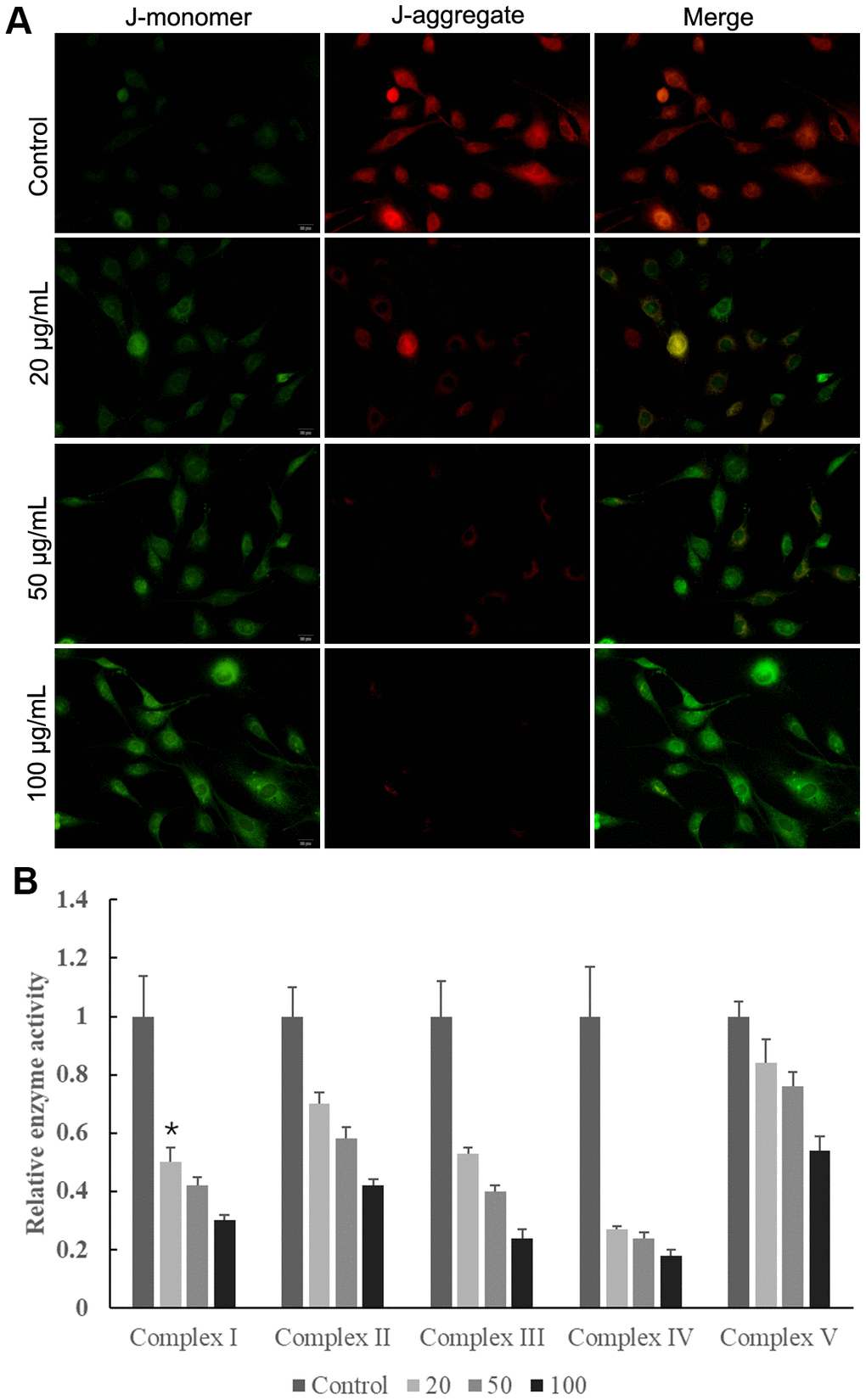 SKOV3 cells were inoculated in 6-well plates, and treated with 0, 20, 50, and 100 μg/mL of MWCNT, respectively, for 24 h. Next, trypsin was used to digest cells with various treatments, and then cells were lysed. Subsequently, the activities of mitochondrial respiratory chain complexes I-V were detected by commercial kits (Jianchen, Nanjing, China).
