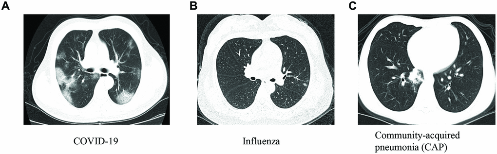 This study was conducted in a region outside of Wuhan, the epicenter of the COVID-19 outbreak. Out of 50 suspected patients enrolled in the discovery and internal validation cohorts, 8 had COVID-19, 8 had seasonal flu (influenza), and 34 had community-acquired pneumonia (CAP) (Table 1). There were no significant differences in characteristics among the three groups, including age, sex, clinical symptoms, WBC, and LYC. Compared to those with influenza and CAP, patients with COVID-19 had significantly lower LYP values (P < 0.001). Representative chest CT images for COVID-19, influenza, and CAP are shown in Figure 1. The external validation cohort from another hospital included 11 COVID-19 patients, 20 with influenza, and 24 with CAP (Table 2).
